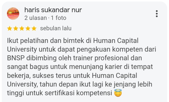 “Ikut pelatihan dan bimtek di Human Capital University untuk dapat pengakuan kompeten dari BNSP dibimbing oleh trainer professional dan sangat bagus untuk menunjang karir di tempat kerja, sukses terus untuk Human Capital University, tahun depan ikut lagi ke jenjang lebih tinggi untuk sertifikasi kompetensi”