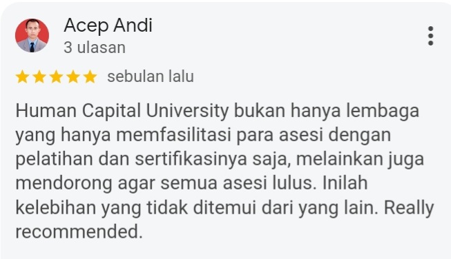 “Human Capital University bukan hanya lembaga yang hanya memfasilitasi para asesi dengan pelatihan dan sertifikasinya saja, melainkan juga mendorong agar semua asesi lulus. Inilah kelebihan yang tidak ditemui dari yang lain. Really Recommended”