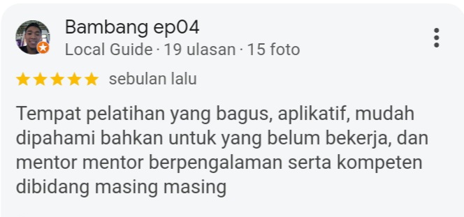 “Tempat pelatihan yang bagus, aplikatif, mudah dipahami bahkan untuk yang belum bekerja, dan mentor-mentor berpengalaman serta kompeten di bidang masing-masing”