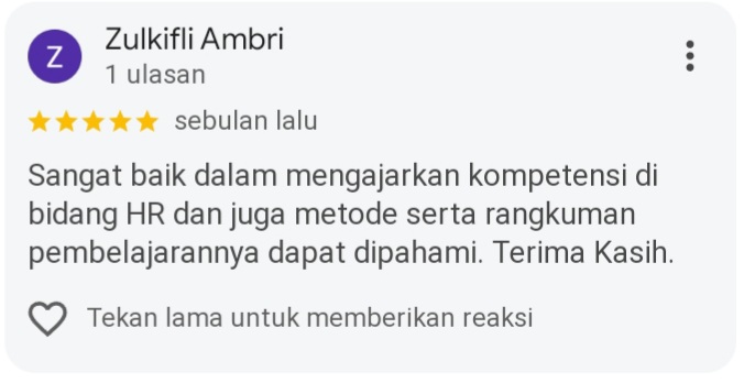 “Sangat baik dalam mengajarkan kompetensi di bidang HR dan juga metode serta rangkuman pembelajarannya mudah dipahami. Terima Kasih”